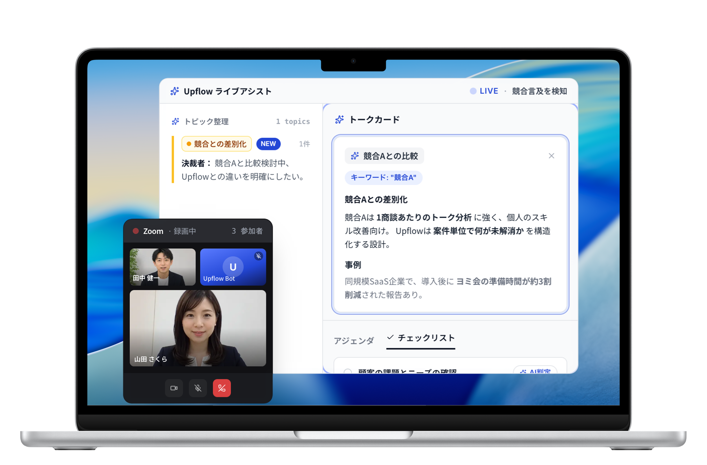 Upflowは、商談の会話データからAIが顧客の状態変化・懸念・意思決定の背景、VoCを自動で構造化する、営業組織のためのAI商談支援プラットフォームです。
